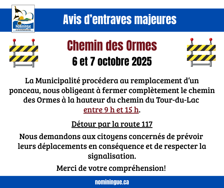 Entraves majeures chemin des Ormes – 6 et 7 octobre 2025
