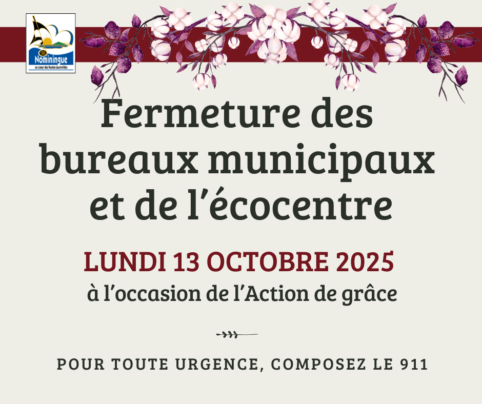Fermeture des bureaux municipaux et de l’écocentre le lundi 13 octobre