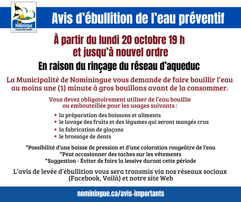 Avis d’ébullition de l’eau préventif – Lundi 20 octobre à compter de 19 h